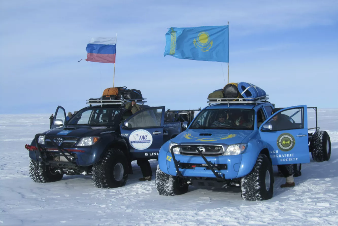 Two Arctic Trucks AT44 Toyota Hilux 4x4 vehicles with Arctic Trucks Polar support personnel guided/supported a team from Kazakhstan and Iceland from Novolazarevskaya, Eastern Antarctica, to the South Pole and back. The expedition to South Pole, 2308 km took only 4.5 days. Following their trail back, the return journey from South Pole to Novo runway took only 3.5 days, averaging 660 km per day.