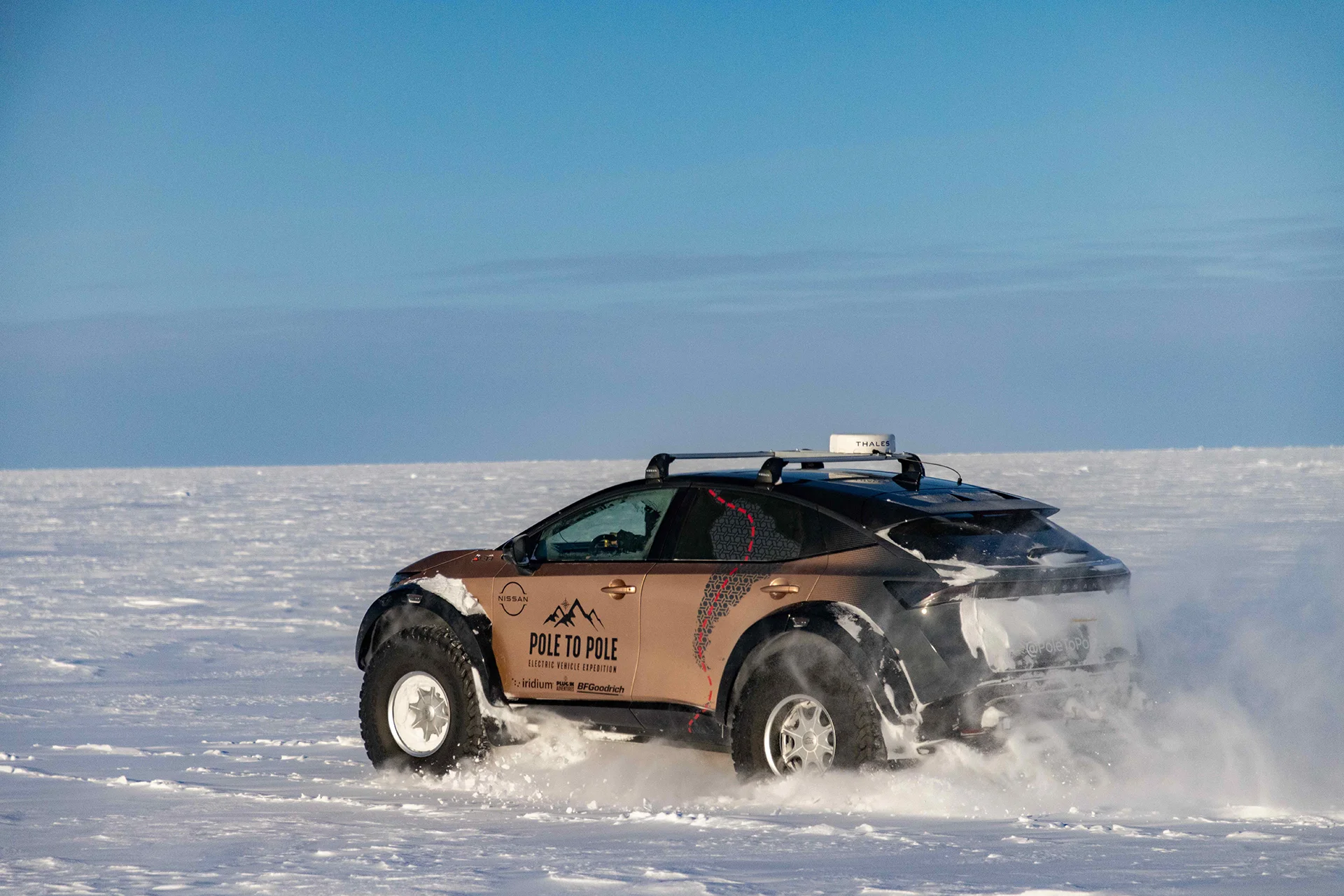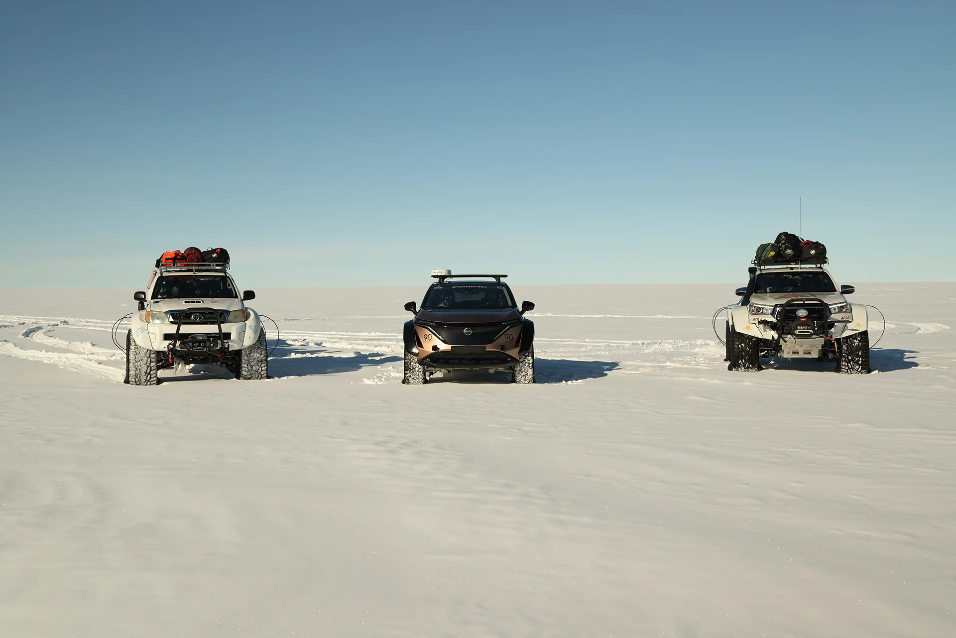 “Pole to Pole EV” expedition: Scottish couple Chris & Julie Ramsay drove an all-electric Nissan Ariya e-4ORCE (heavily modified by Arctic Trucks in Iceland) from the 1823 magnetic north pole to the geographic South Pole, en route creating a Guinness World Record. Arctic Trucks Polar supported the expedition in both the Arctic and Antarctica with two Arctic Trucks AT44 Toyota Hilux 4x4s plus support crew.